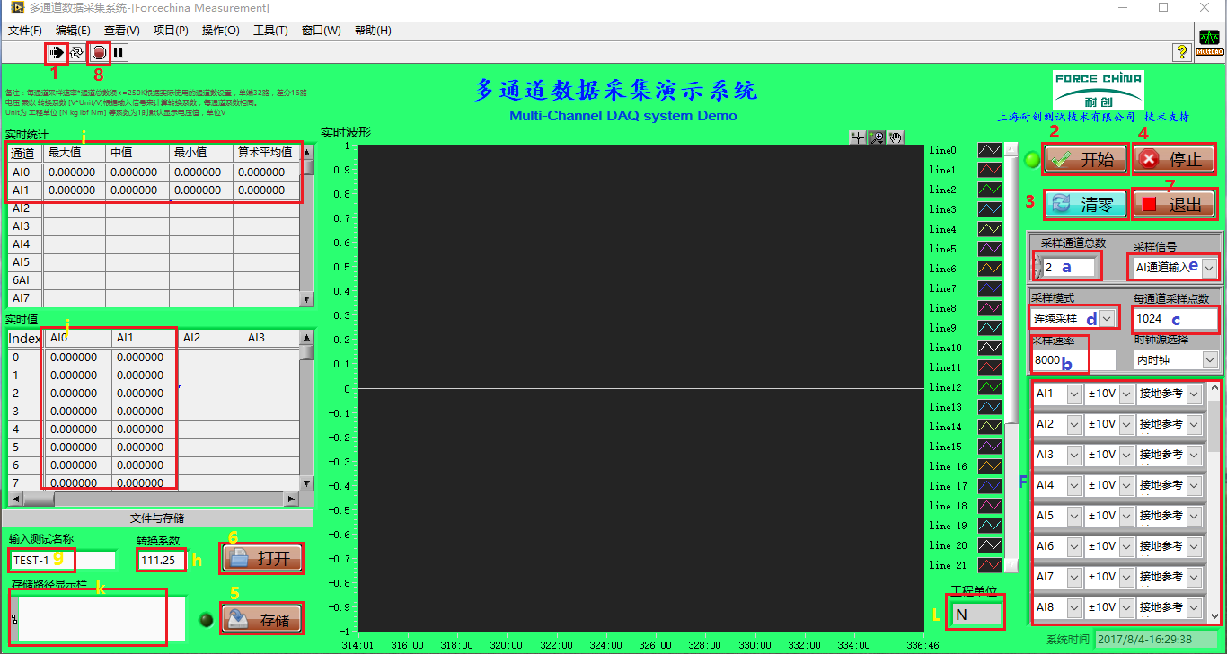 軟件界面可以根據用戶需求設計,對傳感器端反饋的信號進行采集,轉換,顯示曲線,峰值;保存數據到表格或二進制文件;
