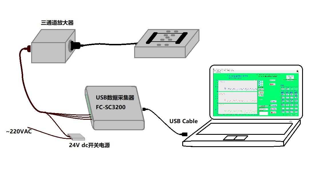 傳感器(原始mV信號)—放大器(標(biāo)準(zhǔn)模擬量)—數(shù)據(jù)采集卡(通過USB)—電腦界面軟件(基于NI LabView編程)。