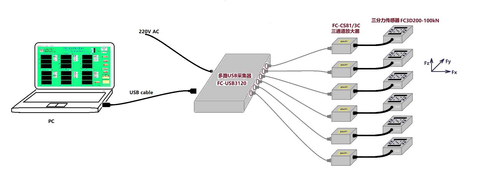 三軸力傳感器結合耐創三通道放大器,后端采用FC-SC3200數據采集器,數據經過AD轉換,傳輸到電腦端軟件,實現實時采集,顯示;